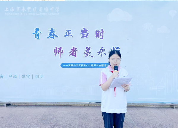 九(2)中队熊兴玥代表九年级全体同学,向老师们送上节日祝福。
