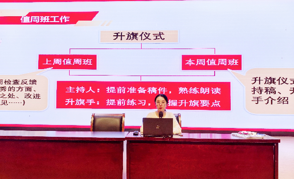 会议伊始,政教处王雪纯围绕本学期团委、少先队工作要点展开介绍。她强调,值周班工作直接影响校园秩序维护,需学生干部严格履职、落实细节;同时鼓励大家报名参与红领巾广播工作,通过创新内容形式传递校园正能量。此外,王雪纯还就下半年入团积极分子选拔事宜进行说明,鼓励有意愿的学生干部把握成长契机,以“以身作则、主动作为、服务同学”为准则,在各类校园活动中发挥才干、展现担当。
