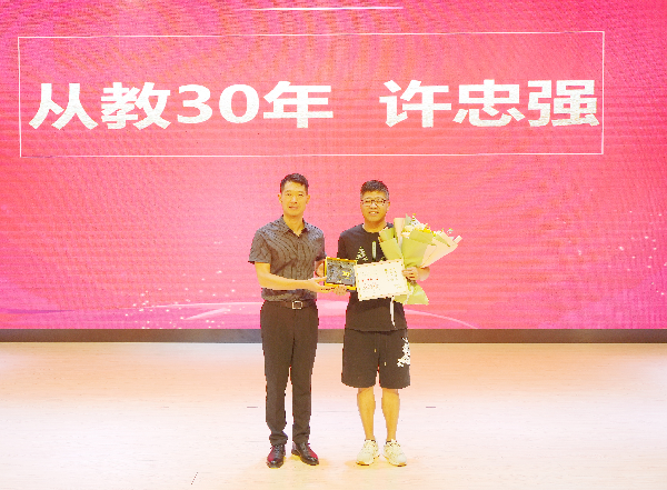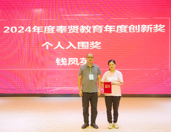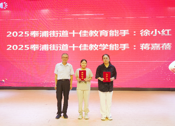活动伊始,政教主任张连花致节日问候并介绍流程后,表彰环节率先展开。徐小红、蒋嘉蓓老师分别获 “奉浦街道十佳教育能手”“奉浦街道十佳教学能手”,钱凤英老师获 “奉贤区 2024 年度教育个人创新奖入围奖”,相关领导为其颁发证书;党支部书记、校长张鹏还为教龄满 30 年的教师许忠强献花,致谢其坚守奉献。