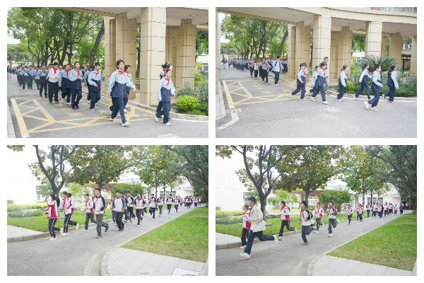 上午7:55,警报声准时响起,演练正式开始。各班级学生在班主任的有序带领下,严格按照预定的广播操路线,保持安全间距,排着整齐的队伍,快速、有序地向操场指定区域撤离。过程中,学生们听从指挥、动作规范,无拥挤、推搡等现象发生。全体师生均在规定时间内安全到达集合地点,随后各班班主任迅速清点人数并上报演练总指挥,确保无人员遗漏。