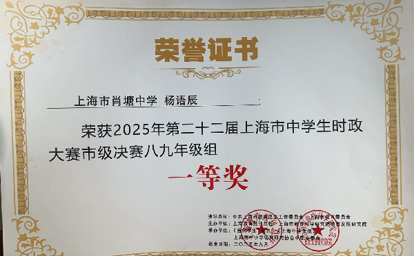 她八年级来到到肖塘中学,虽然初来乍到,但凭着勤奋刻苦的学习精神,迅速适应了新的学习环境。面对全新的历史、道法题型,她在老师讲评时,认真记笔记,加深理解。课后自主搜集试卷标准答案与练习题,加强训练,培养解题思维。作业出现问题,及时订正,不解之处主动向老师询问。最终她在这两门科目取得了不小的进步,还获得了上海市时政大赛一等奖。