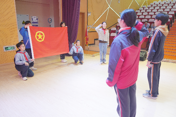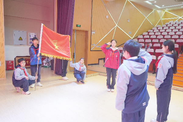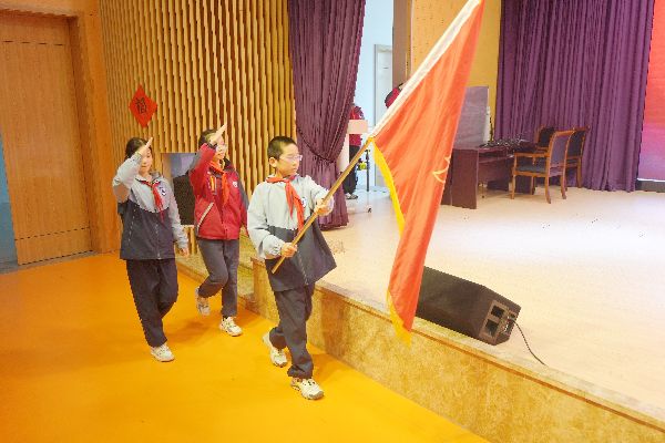 伴随着庄严的队歌,旗手和护旗手踏着稳健的步伐徐徐进场,全体少先队员敬队礼,行注目礼,唱响中国少年先锋队队歌。