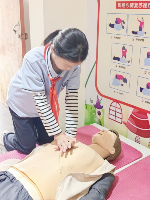 “胸外按压时,掌根要对准患者两乳头连线中点,按压深度5-6厘米,每分钟100-120次!”在我校安全体验教室一场别开生面的应急救护课程正在火热开展。徐兰燕为六年级学生带来心肺复苏(CPR)理论与实践的“沉浸式”学习体验,让青少年在互动中掌握守护生命的“硬核技能”。